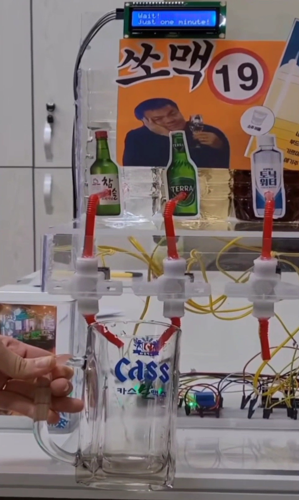 LCD 디스플레이를 통해 현재 상태(맥주 주입 중, 소주 주입 중, 완료 등)를 표시하여 사용자가 과정을 실시간으로 확인할 수 있습니다.