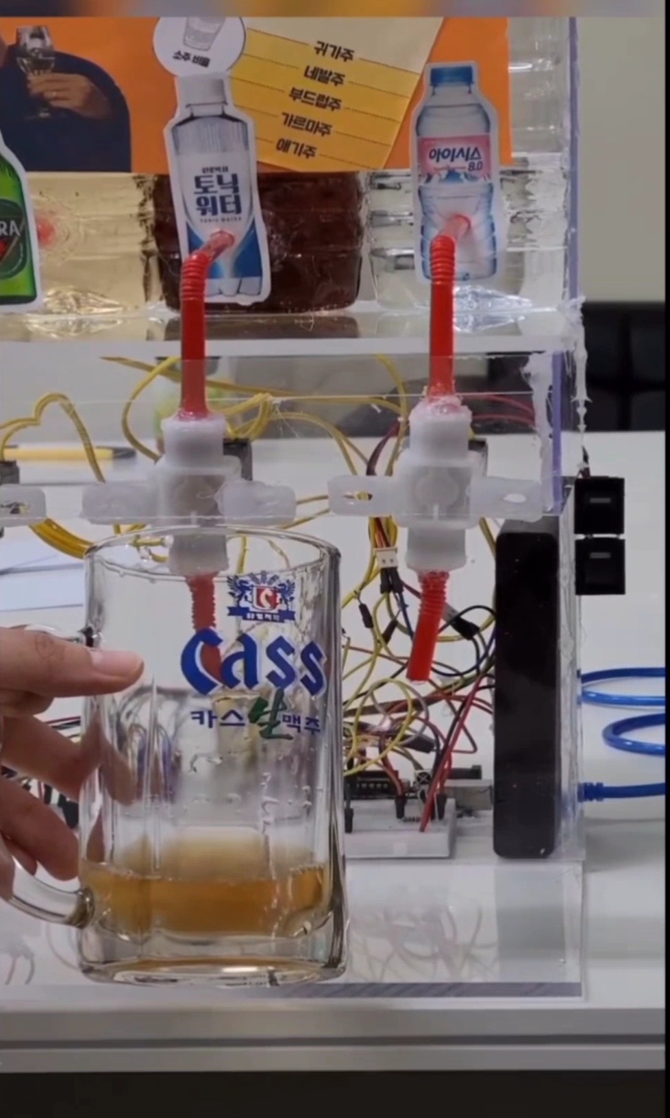 사용자가 리모컨을 이용해 노동주(1번)/귀가주(2번)/네발주(3번)/부드럽주(4번)/가르마주(5번)/애기주(6번)를 누르면, 해당 기기는 원하는 비율의 소맥을 자동으로 제작해 줍니다.