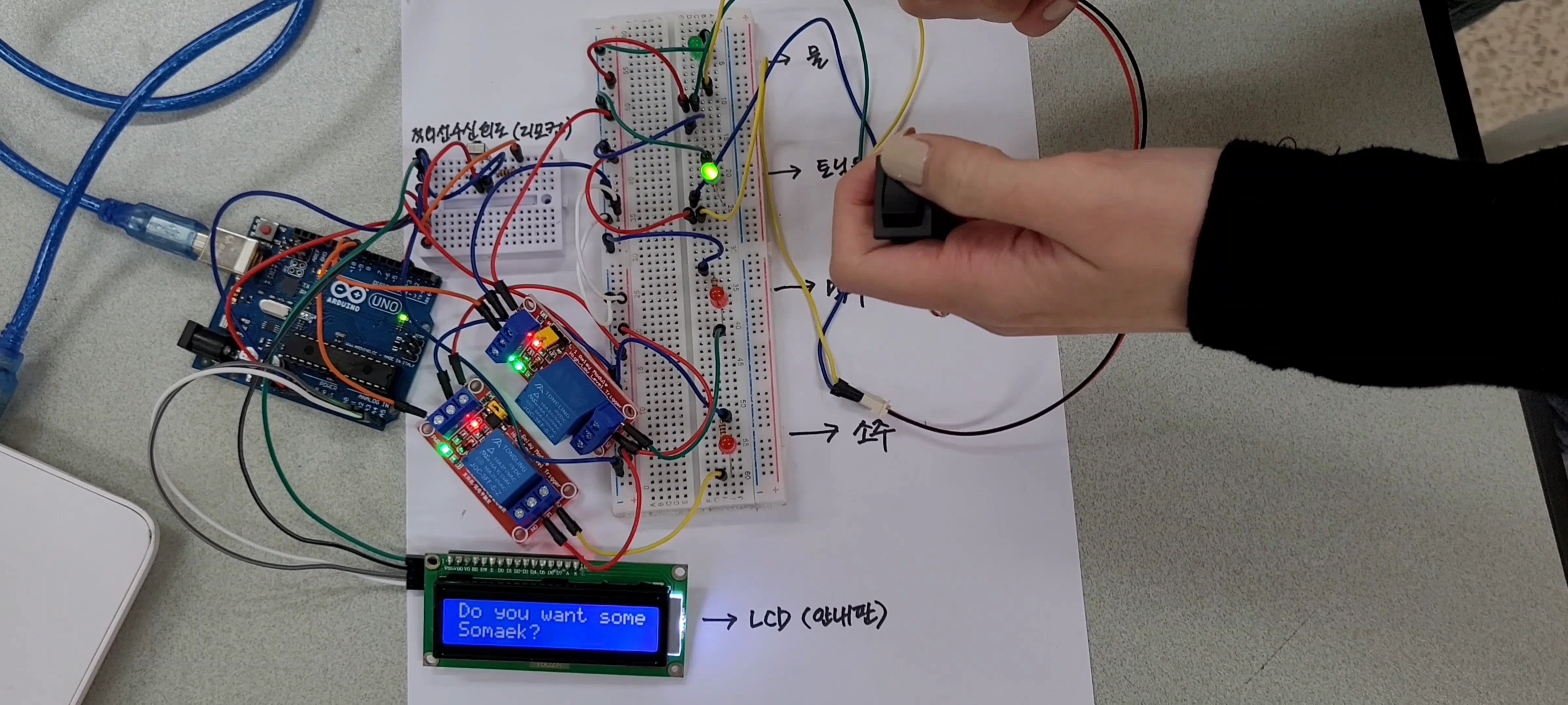 - 브래드보드와 Arduino Uno를 이용한 회로 전체 구성