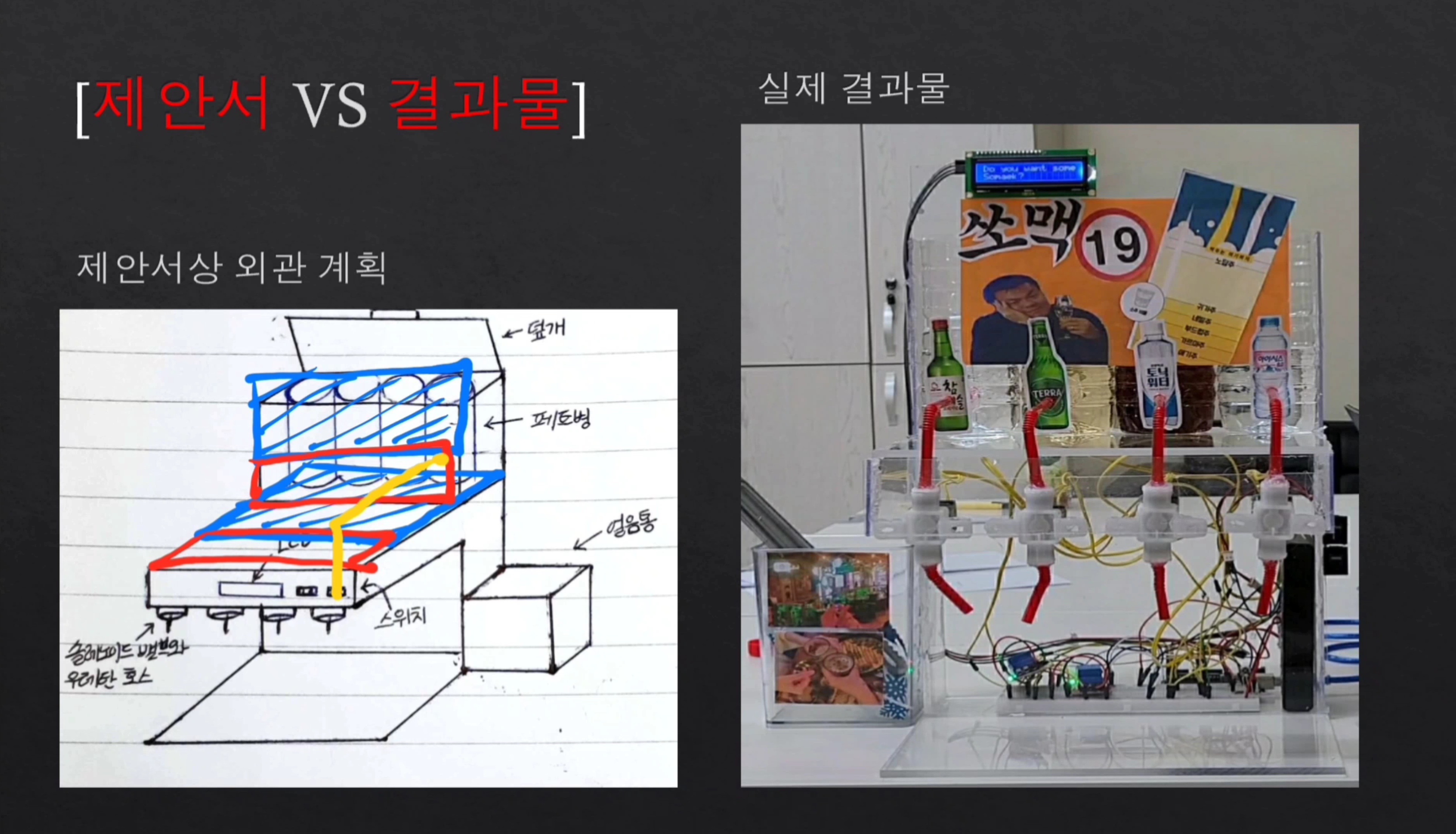 의용전자 수업 기말 프로젝트로 ‘코로나19로 인한 언택트(Untact) 시대, 일상생활 속 즐거움을 찾을 수 있는 아이디어를 개발하라’는 주제가 주어졌습니다. 이에 따라 저희 팀은 실내 소모임에서 활용할 수 있는 자동 소맥 제조기를 제작했습니다.