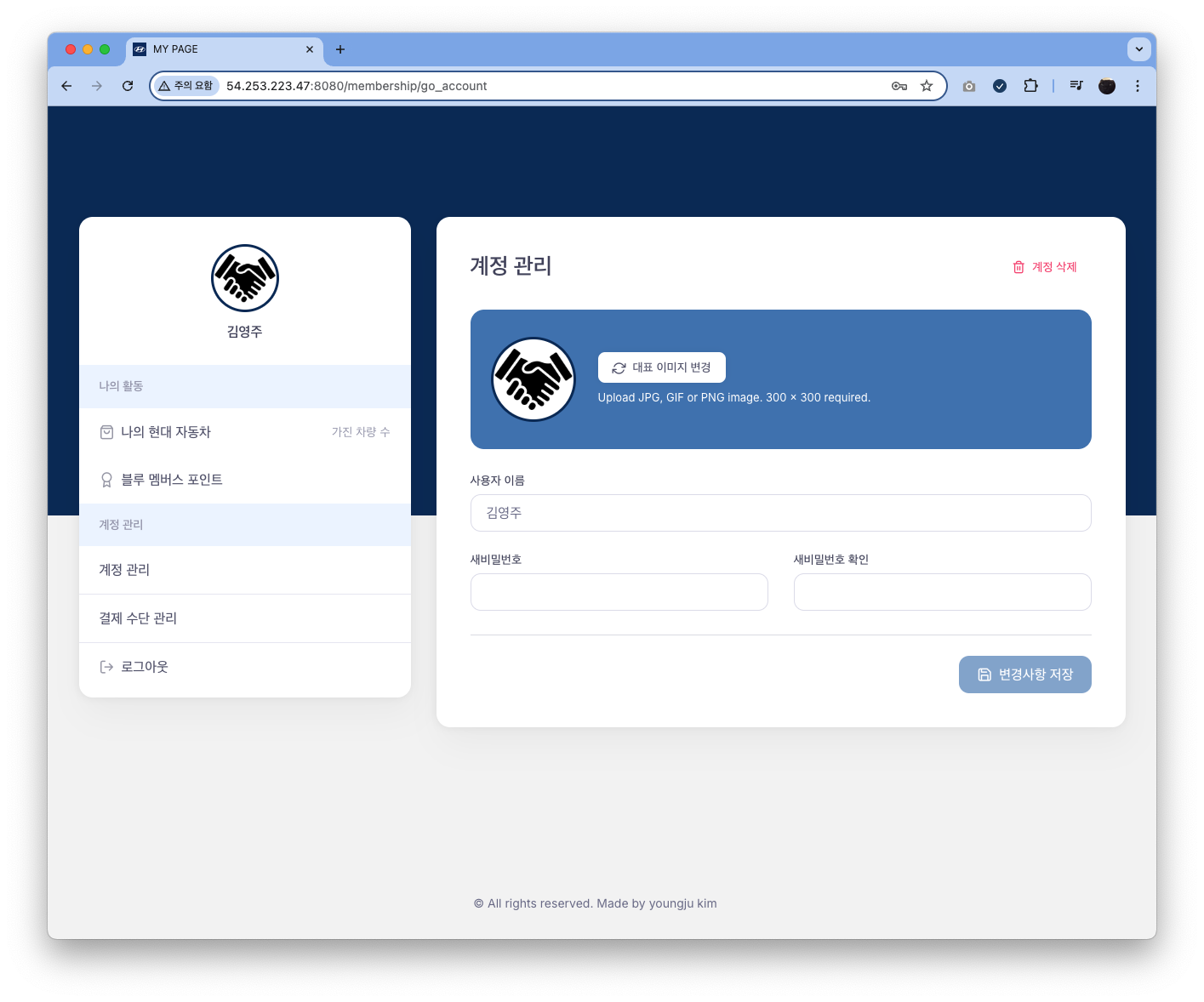 대표 이미지와 비밀번호, 이름을 변경할 수 있습니다.